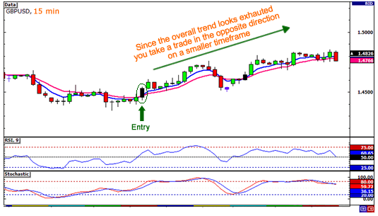 由于我们的想法是“逆势”,我们会在较小的时间范围内(例如 15 分钟图表)寻找与整体趋势相反方向的交易。